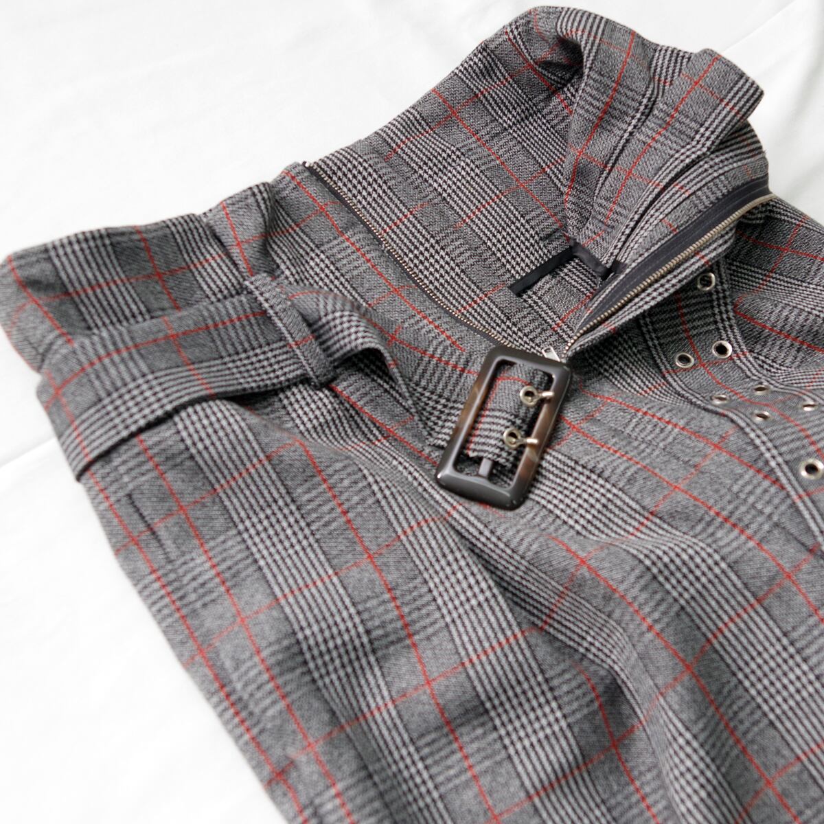 【即納】チェック柄ウールパンツ(グレー) ハイウェスト 秋冬 ボトム ベルト